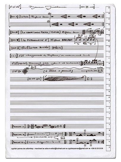Cyprien Parvex de Collombey est un artiste Franco-Suisse né en 1982, diplômé de l’École Supérieure des Beaux Arts de Marseille et du Conservatoire National de Région Pierre Barbizet. Ses champs de recherche s’axent sur l’étude de documents et d’archives musicales, et la mise en espace de concepts littéraires et poétiques protéiformes. Au travers de formes visuelles et sonores, ses réalisations questionnent constamment le son, la musique, ainsi que les protocoles d'écriture et d’écoute.