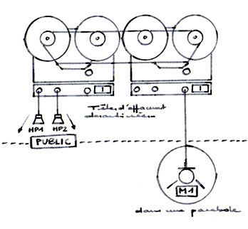 Un magnétophone à bande magnétique dont nous aurons pris soin de rendre inopérante la tête d’effacement. Une piste tournant en boucle [Non pas enroulée sur deux bobineaux séparés, entraînant la bande, l’enroulant progressivement, le début placé à gauche et la fin à droite - indépendamment l’un de l’autre, donnant au temps un déroulement effectif.] Une boucle simplement entraînée par le cabestan et tournant librement autour des bobineaux immobilisés. Un microphone (mono) perché au dessus du public - M1 Une paire de hauts-parleurs dirigée vers le public - HP1/HP2 M1 enregistre (capte), sur la bande montée en boucle, les sons émis par le public,